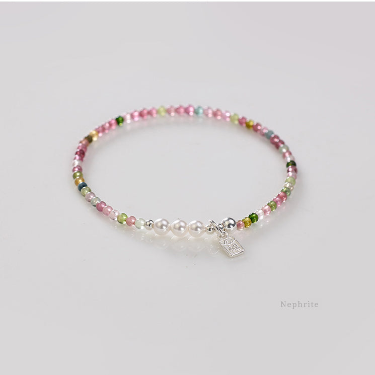Rainbow Tourmaline & Freshwater Pearl Bracelet with 925 Silver Char